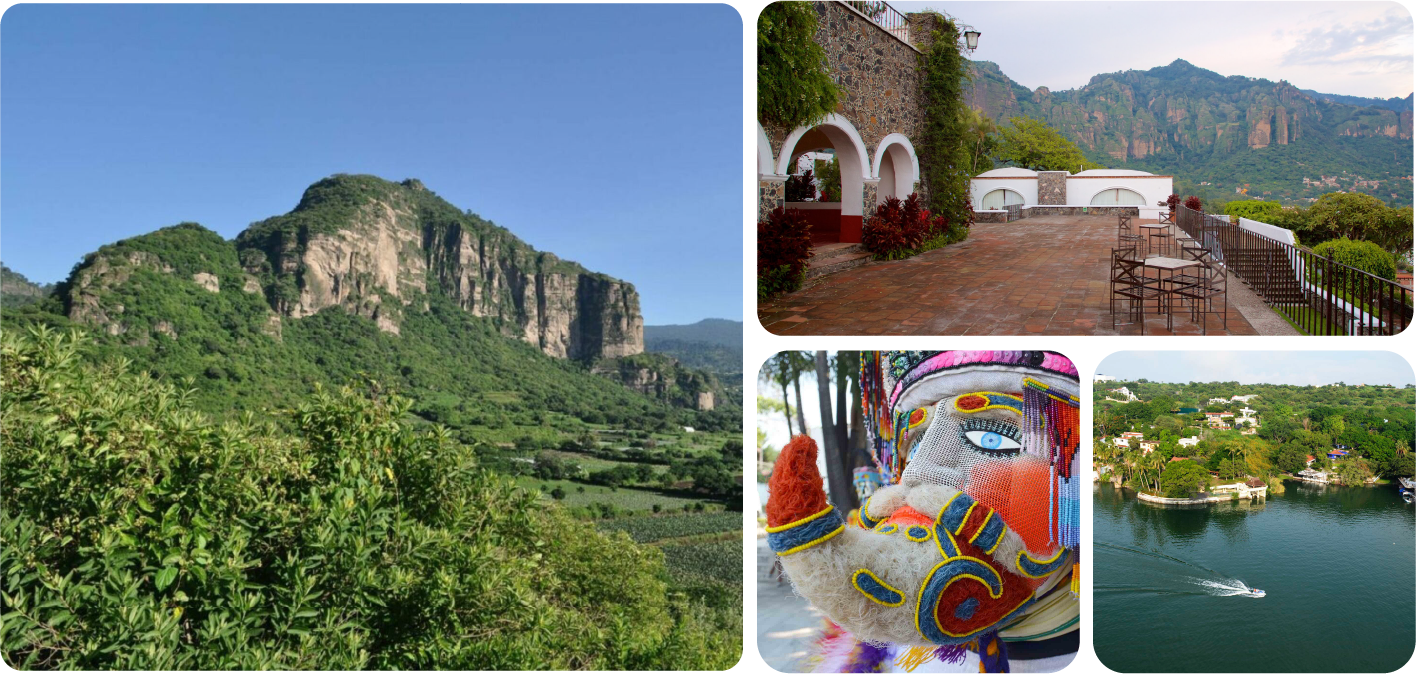 Encontramos la ciudad de Cuernavaca, conocida como la "Ciudad de la Eterna Primavera" por su clima agradable y su arquitectura colonial. Zonas arqueológicas que ofrecen una visión única de la cultura de la región.