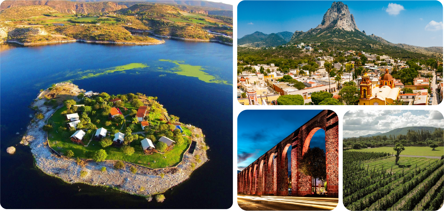 Querétaro ubicado al centro del país, posee los más diversos atractivos turísticos para todos los gustos e intereses. La rica mezcla entre la contemporaneidad de su Metrópoli con el pasado vibrante de su Centro Histórico, maravillas naturales de su Sierra Gorda, pasando por el atractivo culinario de su región de vinos y quesos, la tranquilidad de sus bosques y campos